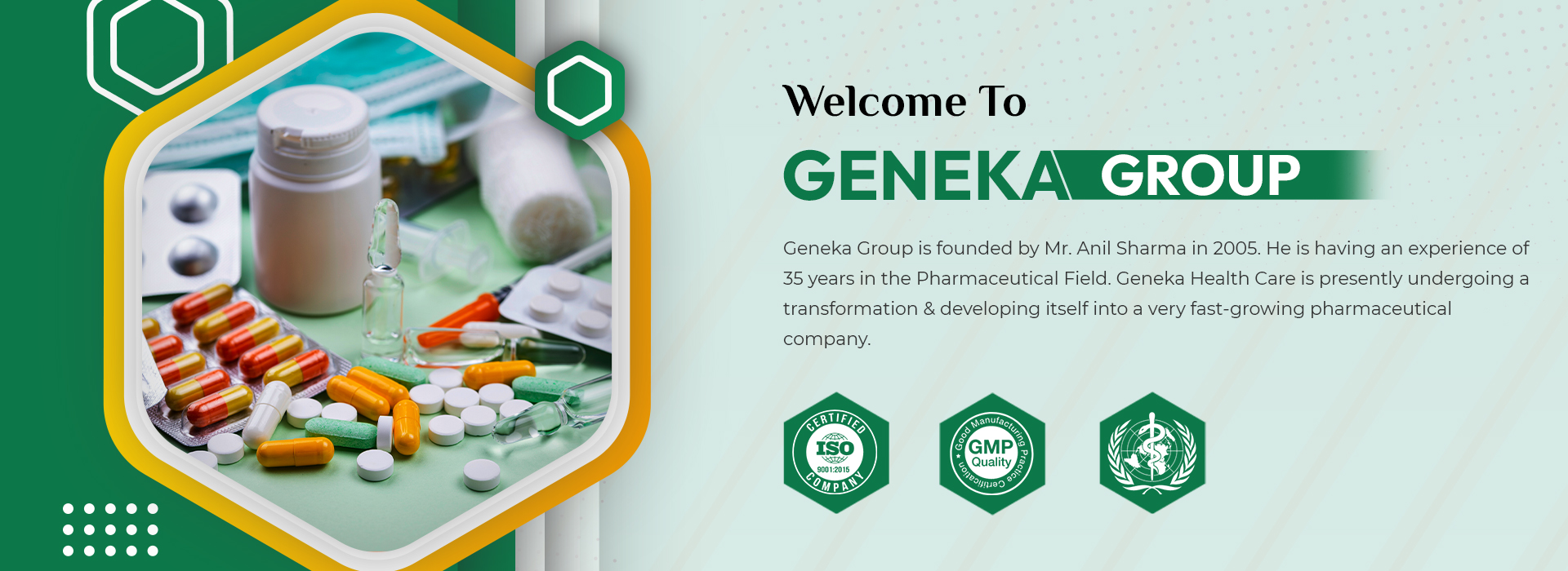 Geneka Group is Headed by Mr. Anil Sharma established in 2007. His varied interests are in the fields of the Health Care Industry, Real Estate, Educational Institutions & Distribution of Pharmaceutical Products.